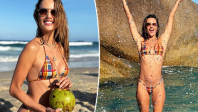 Alessandra Ambrosio soaks up the sun in teeny plaid bikini during Brazilian getaway